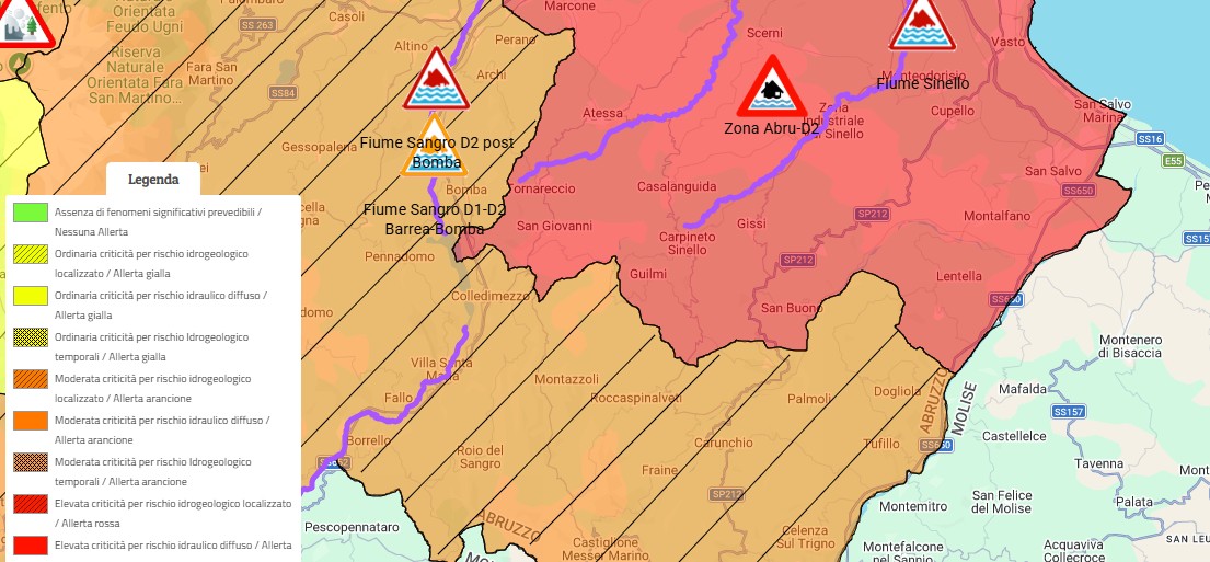 Il Centro Funzionale d’Abruzzo comunica che per la giornata di OGGI, GIOVEDÌ 2 APRILE 2026 e per la giornata di DOMANI, VENERDÌ 3 APRILE 2026, prevista CRITICITA' ELEVATA/ALLERTA ROSSA per RISCHIO IDRAULICO DIFFUSO su ABRU-D2 (Bacino basso del Sangro); prevista CRITICITÀ MODERATA / ALLERTA ARANCIONE per RISCHIO IDRAULICO DIFFUSO su ABRUC (Bacino del Pescara); prevista CRITICITA' MODERATA / ALLERTA ARANCIONE per RISCHIO IROGEOLOGICO LOCALIZZATO su ABRU-A (Bacini del Tordino- Vomano) e ABRU-D1 (Bacino alto del Sangro); prevista CRITICITÀ ORDINARIA/ALLERTA GIALLA per RISCHIO IROGEOLOGICO LOCALIZZATO sulle RESTANTI ZONE DI ALLERTA.